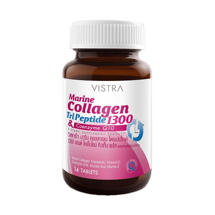 Vistra Marine Collagen Tripeptide 1300 mg – Marint kollagen med tripeptider och vitamin C för vacker hud, starka naglar och friskt hår.   Storlek: 30 tabletter Typ: Marint kollagen (Marine Collagen Tripeptide) 1300 mg Med tillsatt Vitamin C   Fördelar: – Tripeptid-kollagen för bättre absorption – Vitamin C bidrar till normal kollagenbildning – Stödjer hud, hår och naglars hälsa – Främjar ledhälsa och elasticitet i huden   Importerad direkt från Thailand – garanterad kvalitet till ett oslagbart pris.